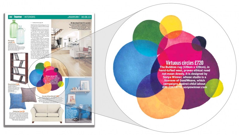 It is designed by Sonya Winner, whose studio is a licensee of GoodWeave, which campaigns against child labour.” Katrina Burroughs