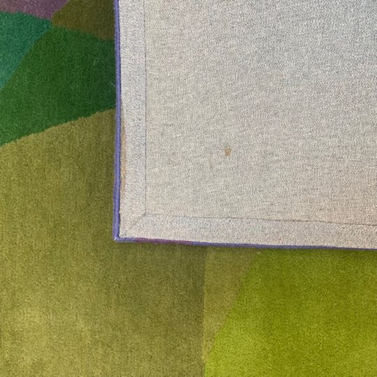 A dynamic nature-inspired rug available at a 50% discount. This piece has been used in a photo shoot and has a few stains which are not very visible unless looked at up close. The spots can be easily covered by a chair or coffee table. There are also a few stains on the back canvas, not visible on the front.