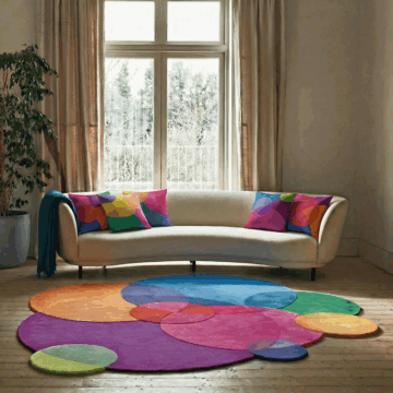 Bubbles area rug is composed of 9 distinctly coloured circles of various sizes, which overlap creating a joyful play of shape and colour. This brightly coloured piece brings a splash of colour to any space and is ideal for living rooms, bedrooms, entrance halls and children’s rooms.