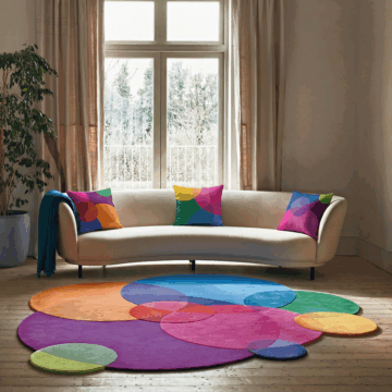 The colourful Bubbles runner rug is handmade entirely in pure wool by artisan weavers, using colour playfully, like translucent paper. This natural wool rug represents bubbles blown from a wand, clustering together and reflecting surrounding colours as they float. The vibrant runner features round areas of blue, green, yellow, pink, purple, red, and orange. These colours overlap to create subtle hue changes of violet, aqua, and more. These overlapping colours create effects of transparency, luminosity, and light within the solid wool fibres. The 3D tuft heights in the composition further enhance the layering effect.